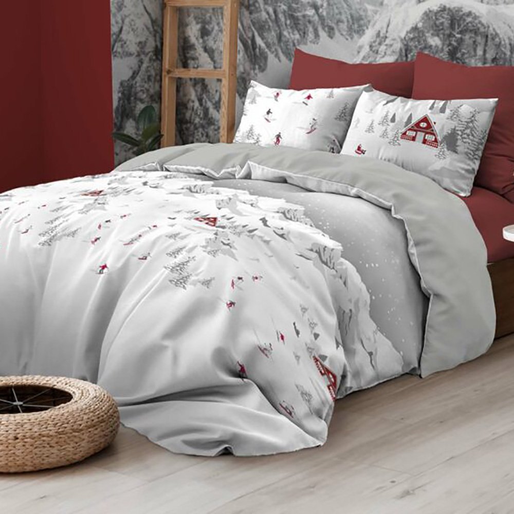 Il copripiumino Chalet è realizzato in puro cotone 100%. Fresco, tessuto morbido e facilissimo da stirare. Presenta una stampa doubleface: da un late grigio chiaro/bianco con chalet in bordeaux e sciatori, dall’altra tinta unita grigio chiaro, come da immagine. La parure è composta da un sacco copripiumino cm 250×200 + 40 di patella e 2 federe con chiusura all’americana cm 52×82