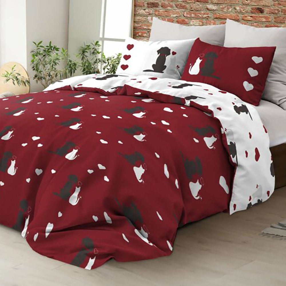 Il copripiumino Dolci Amici è realizzato in puro cotone 100%. Fresco, tessuto morbido e facilissimo da stirare. Presenta una stampa doubleface: da un late base rosso con gattino e cagnolino, dall’altra base bianca sempre con gattino, cagnolino e cuori, come da immagine. La parure è composta da un sacco copripiumino cm 250×200 + 40 di patella e 2 federe con chiusura all’americana cm 52×82